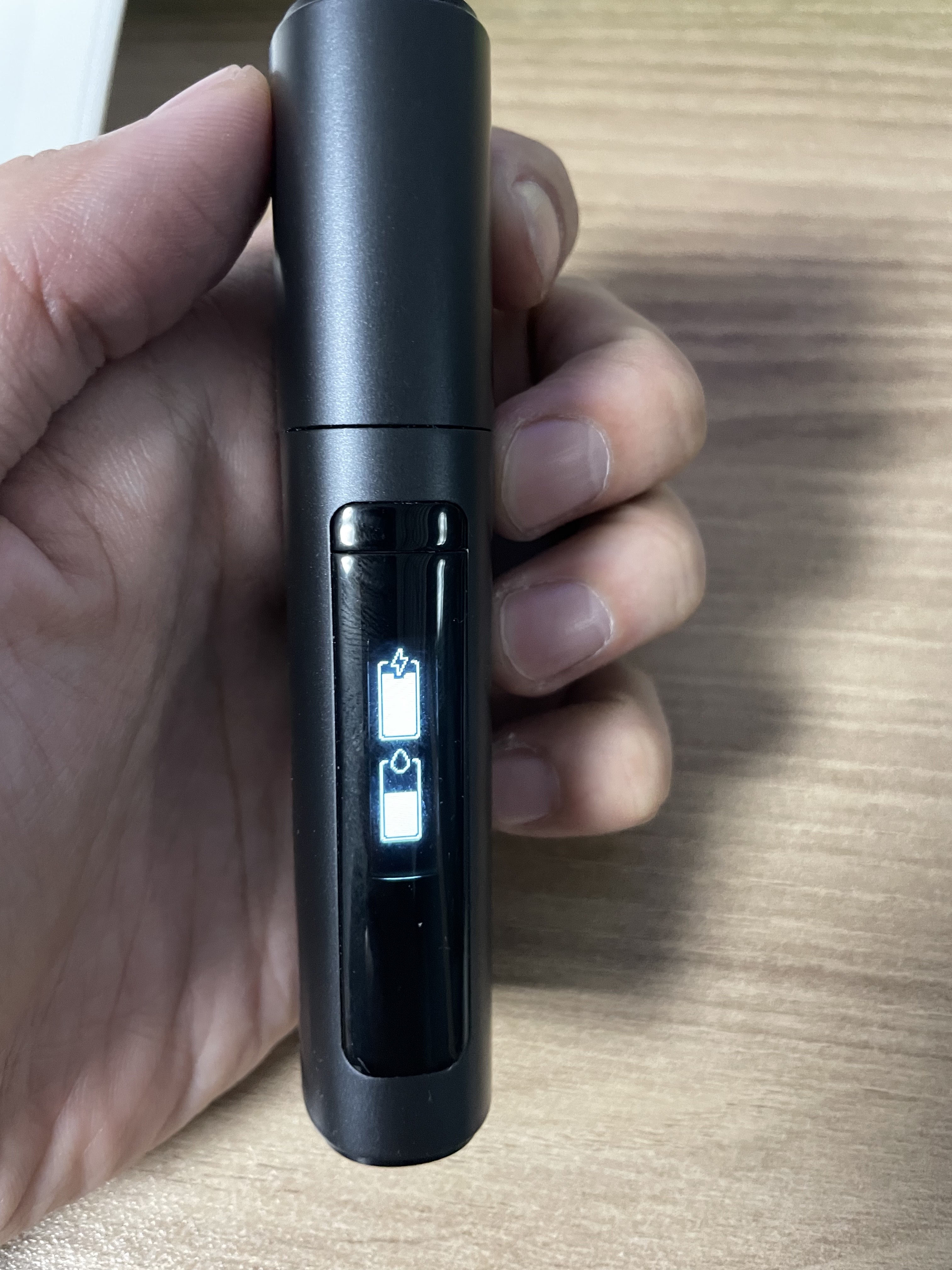 사용 안 할 때 액정 위에 버튼 누르면 저렇게 배터리 잔량, 액상 잔량 표시되고 액상은 부족하면 하나 다 피웠을 때 부족하다고 깜빡거리면서 알려줘요.